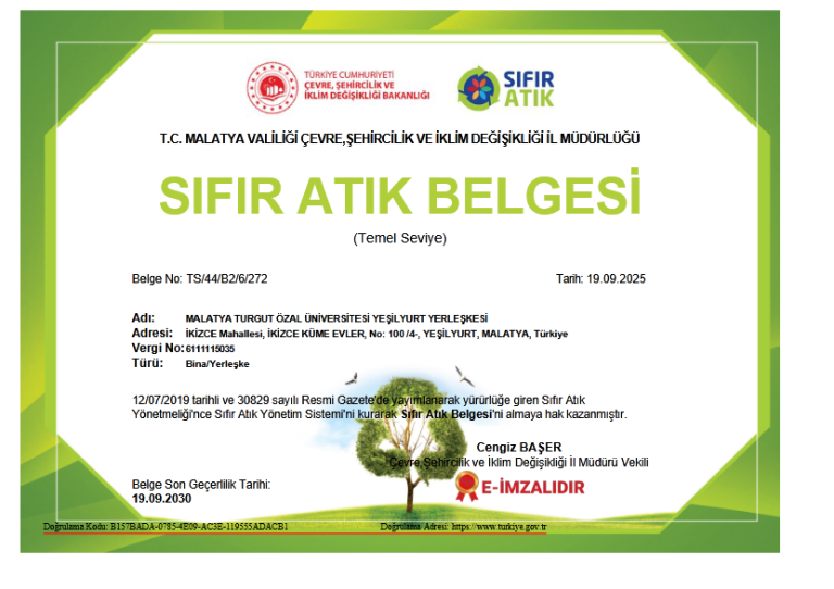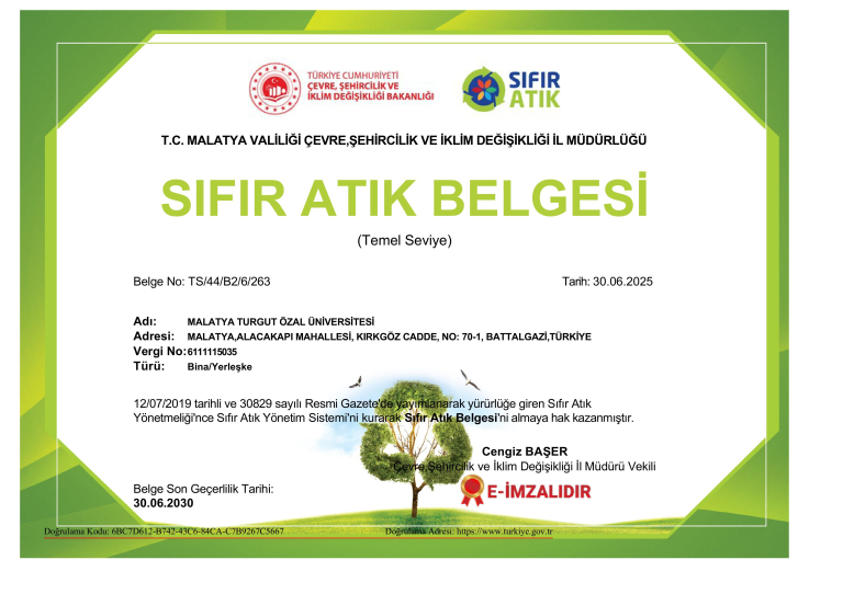 Malatya Turgut Özal Üniversitesi, çevreye duyarlı çalışmalarını sürdürülebilirlik anlayışı çerçevesinde kararlılıkla yürütmeye devam ediyor. Bu kapsamda üniversitemiz, Sıfır Atık Projesi doğrultusunda gerçekleştirdiği çalışmalar sonucunda önemli bir başarıya imza atarak Battalgazi ve Yeşilyurt yerleşkeleri için “Sıfır Atık Belgesi” almaya hak kazandı.